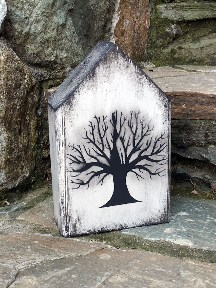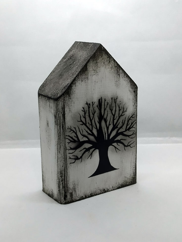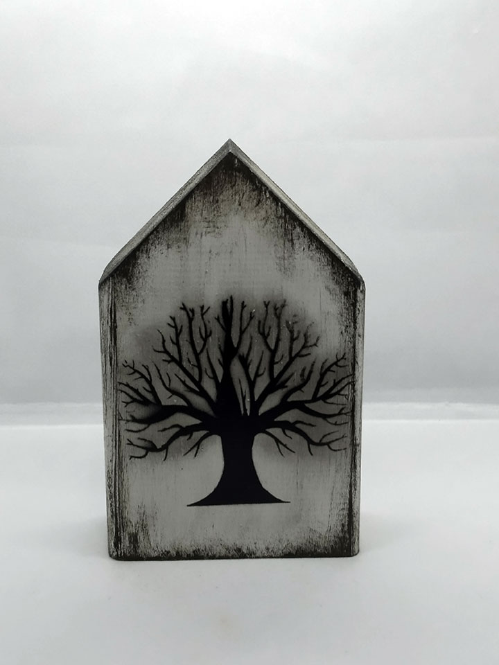 Χειροποίητο διακοσμητικό σπιτάκι από μασίφ ξύλο ελάτης αποτυπώνοντας το δέντρο της ζωής, σύμβολο αιωνιότητας και καλοτυχίας, με στοιχεία παλαίωσης. Ένα χειροποίητο διακοσμητικό που μπορεί να διακοσμήσει τα ράφια και την τραπεζαρία σας καθώς και να χρησιμοποιηθεί και σαν βιβλιοστάτης, προσθέτοντας ένα διαφορετικό ύφος στο χώρο σας. Ιδανικό για ένα διαφορετικό εκλεκτισμένο δώρο για τα αγαπημένα σας πρόσωπα καθώς και για την καλόγουστη διακοσμητική του σπιτιού σας. Διάσταση 21 Χ12 εκ.