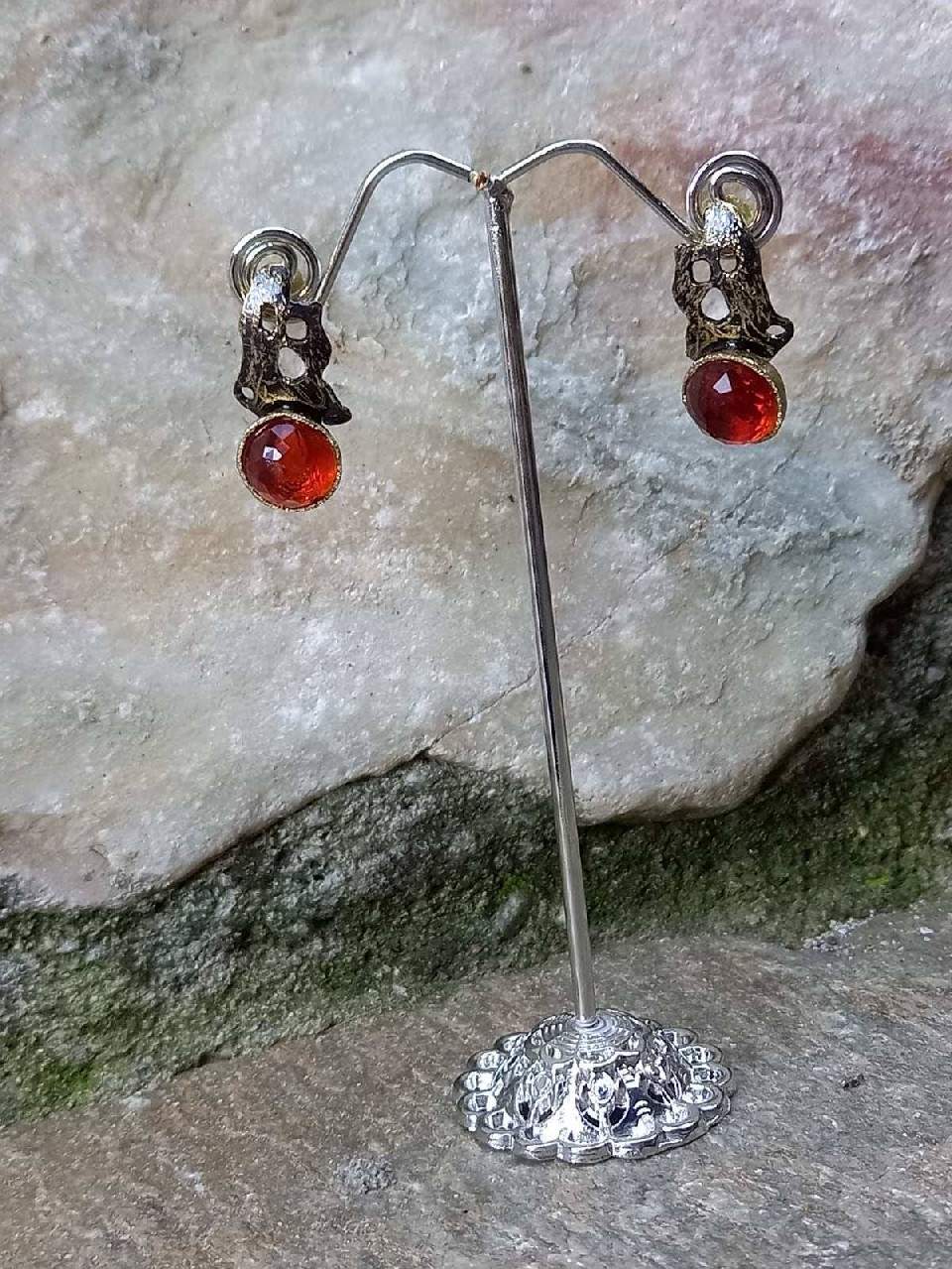 Σκουλαρίκια από ορείχαλκο με τεχνική οξείδωσης και κρυστάλλινες λεπτομέρειες.